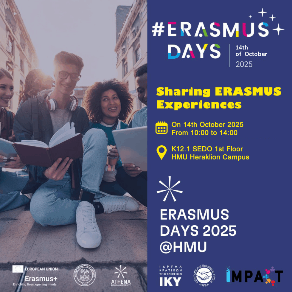 Κάθε χρόνο, περισσότεροι από 200 φοιτητές και μέλη του προσωπικού του ΕΛΜΕΠΑ αξιοποιούν τις ευκαιρίες κινητικότητας του προγράμματος ERASMUS για σπουδές, πρακτική άσκηση, επιμόρφωση και διδασκαλία σε χώρες της Ευρώπης και του εξωτερικού. Το Τμήμα Δημοσίων και Διεθνών Σχέσεων του ΕΛΜΕΠΑ https://iro.hmu.gr/ έχει τη χαρά να διοργανώσει μια εκδήλωση αφιερωμένη στις εμπειρίες των φοιτητών και του προσωπικού του Ιδρύματος μέσα από αυτές τις μετακινήσεις.