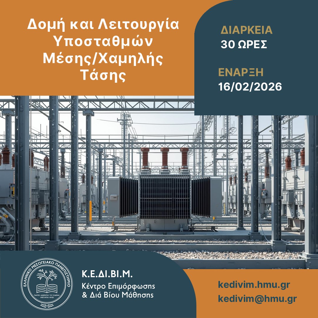 Το Κέντρο Επιμόρφωσης και Διά Βίου Μάθησης του Ελληνικού Μεσογειακού Πανεπιστημίου (ΕΛΜΕΠΑ) οργανώνει νέο πρόγραμμα επιμόρφωσης με αντικείμενο τη «Δομή και Λειτουργία Υποσταθμών Μέσης/Χαμηλής Τάσης».